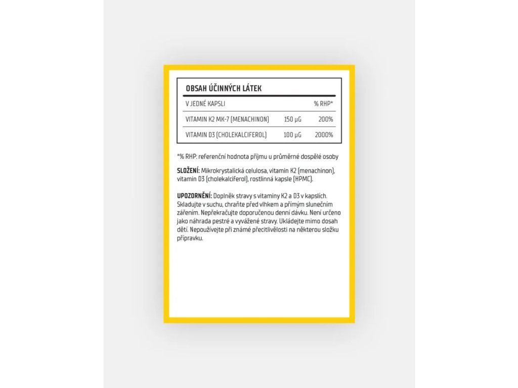 SLOŽENÍ: Mikrokrystalická celulosa, vitamin K2 (menachinon), vitamin D3 (cholekaciferol), rostlinná kapsle (HPMC).