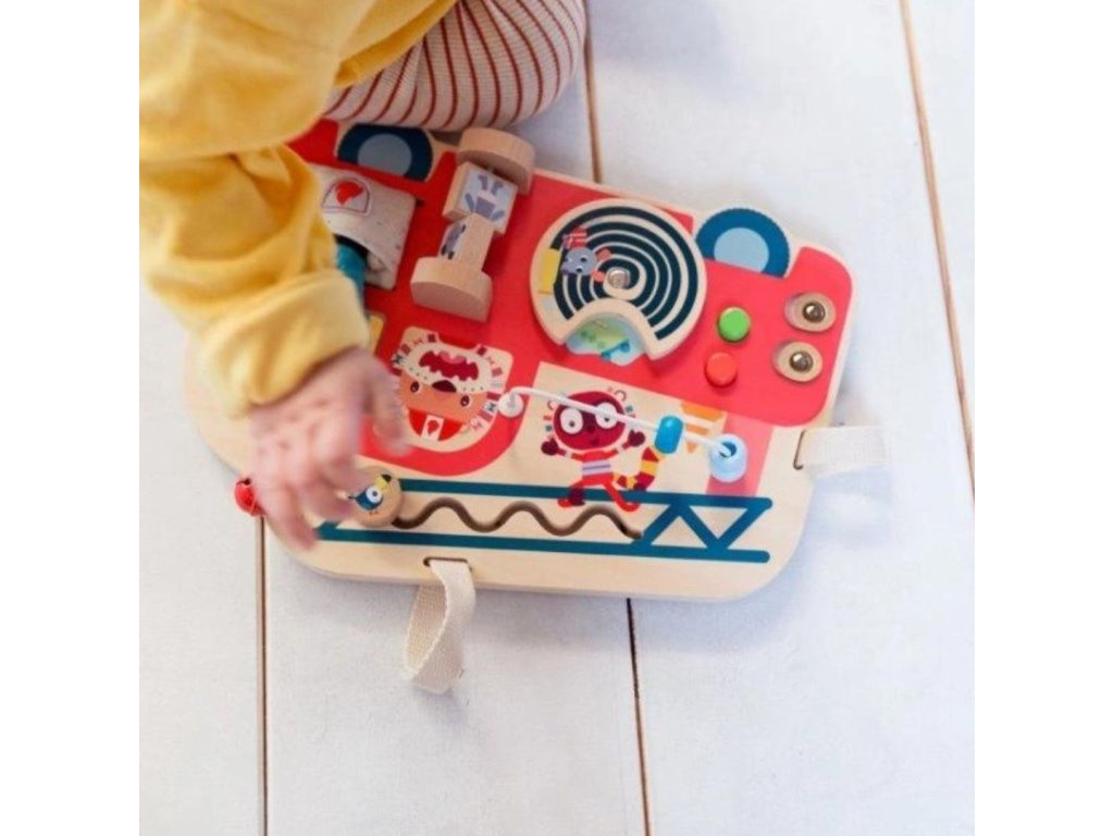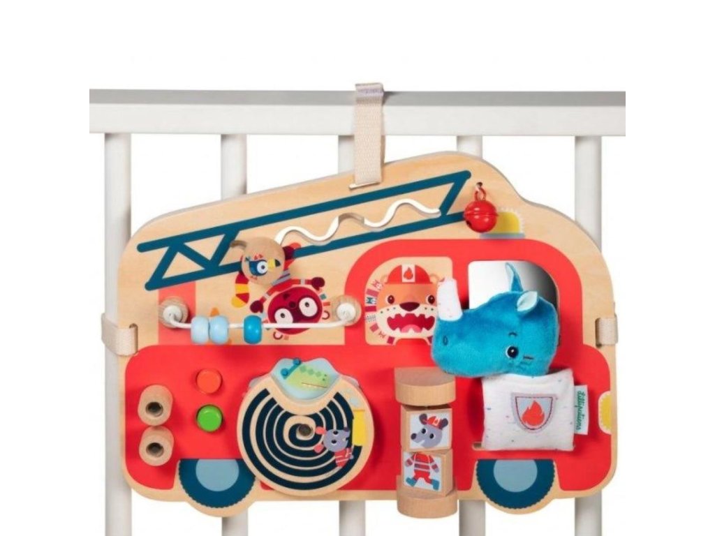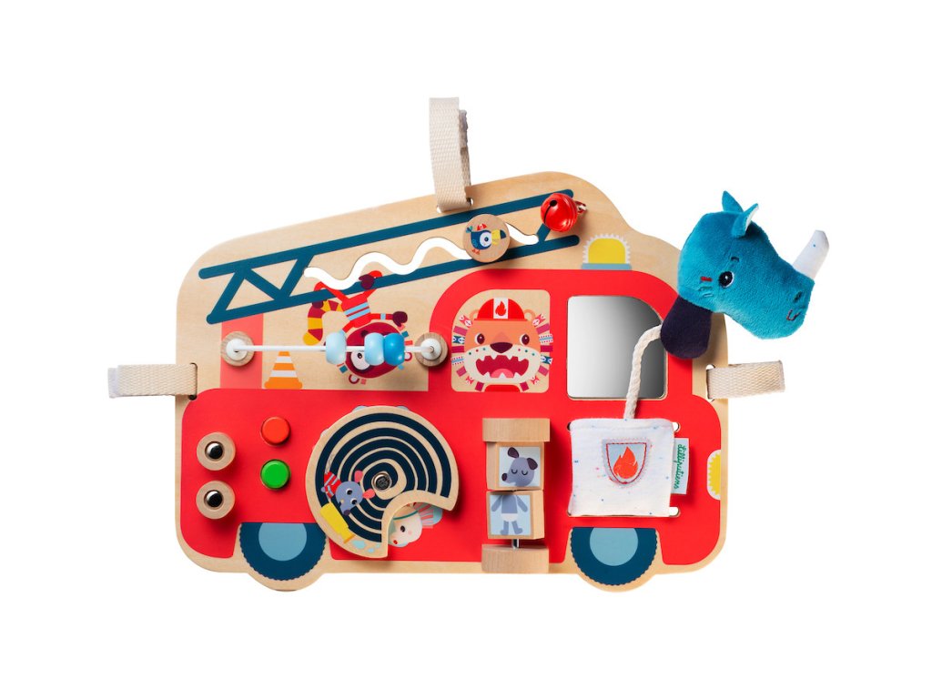 Dřevěný panel ve tvaru hasičského vozu nabízí spoustu aktivit a materiálů, které nejmenším dětem pomáhají objevovat svět kolem sebe.
