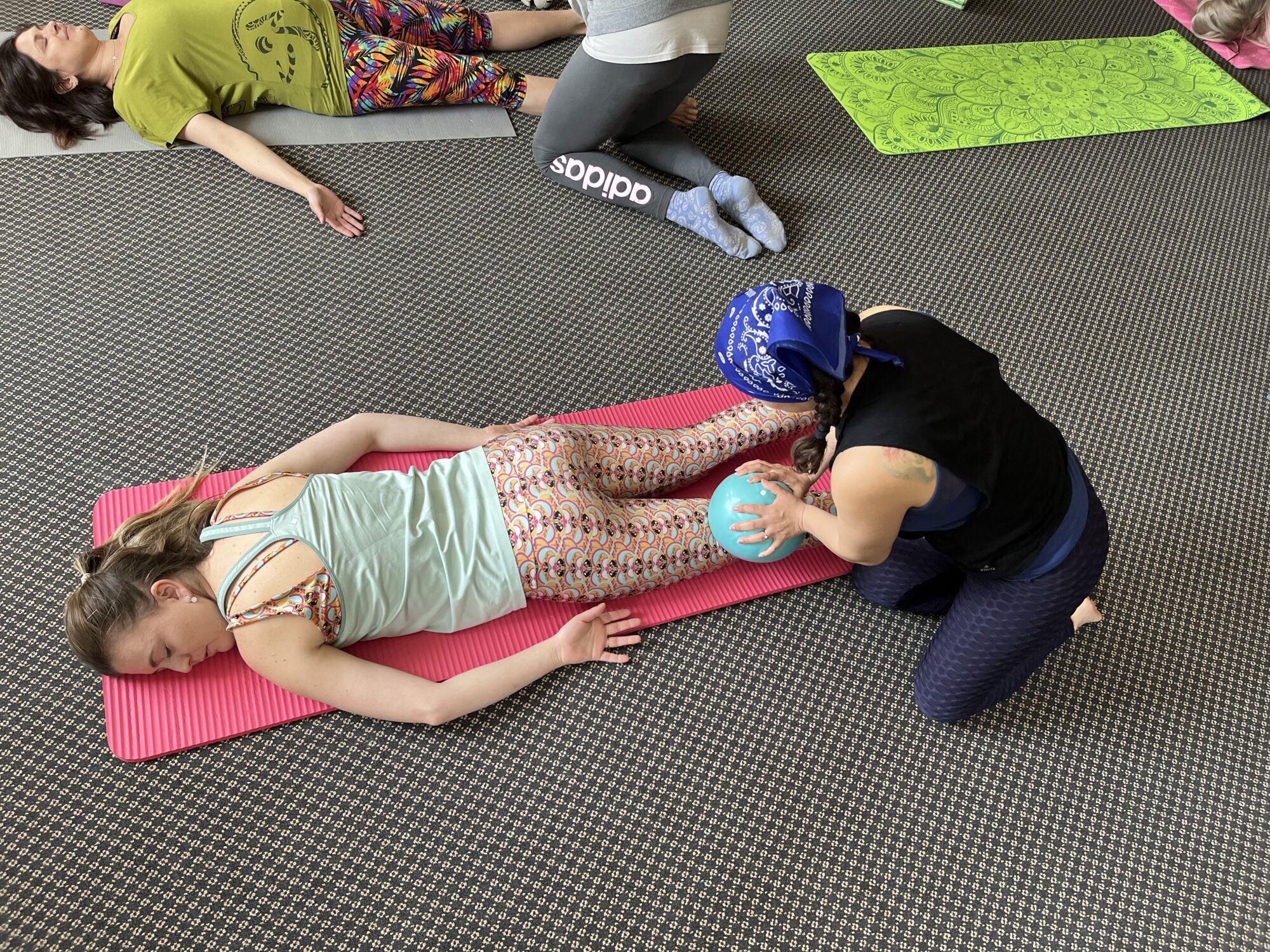 Položte se na podložku a nechte vedle sebe volně horní i dolní končetiny. Masírující si vezme míč a pomalu tlakem od nohou přes celé tělo postupuje směrem nahoru. Je potřeba se mezi sebou domluvit, jak velký tlak je komu příjemný, nesmíme ale zase jen tak hladit, aby došlo k uvědomění si hranic svého těla.
