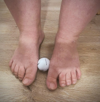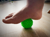 Vsedě nebo ve stoje přejíždíme chodidlem přes masážní míček od přednoží k patě.
