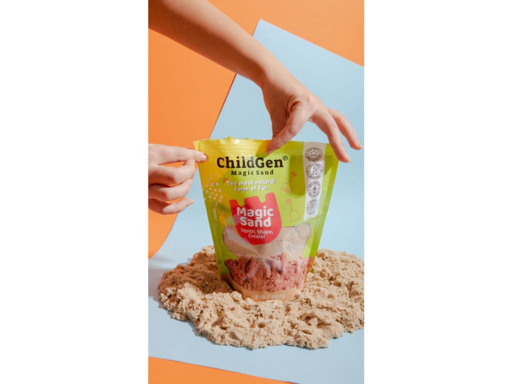 Dostupný v pěti barvách: přírodní, zelená, žlutá, fialová, modrá, oranžová a růžová – kinetický písek ChildGen přináší jedinečnou zábavu bez nepořádku.