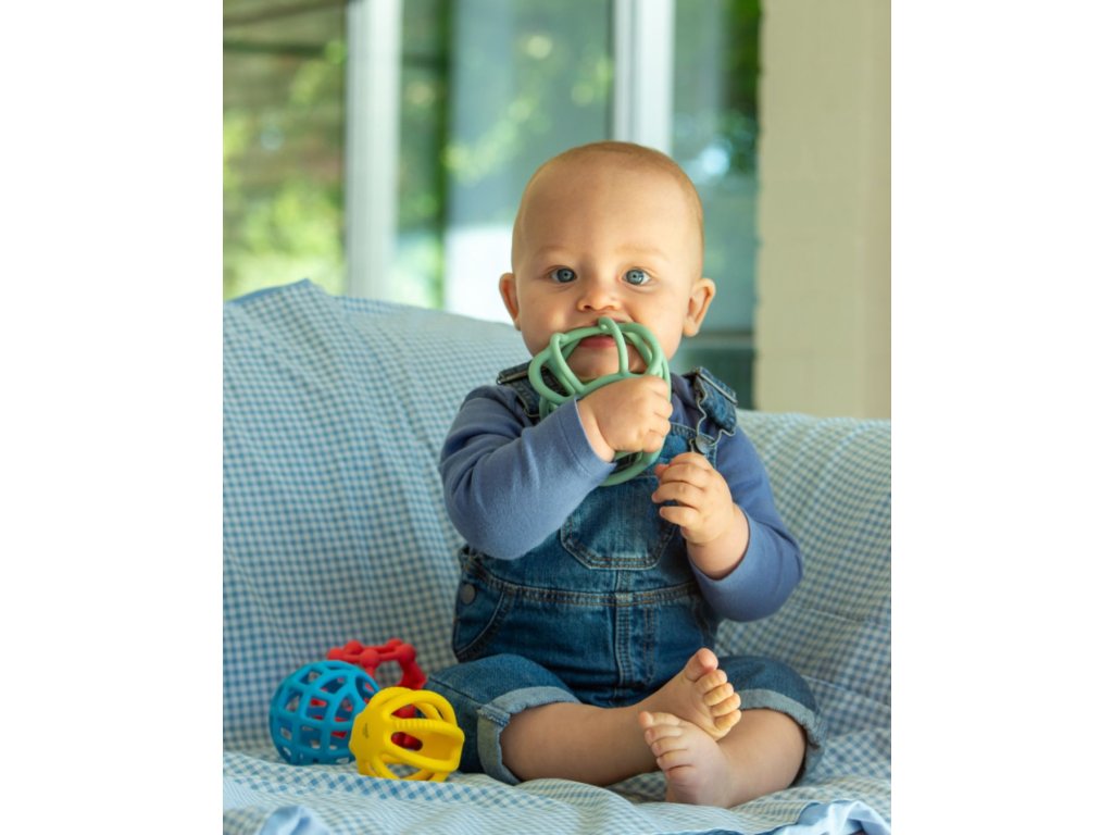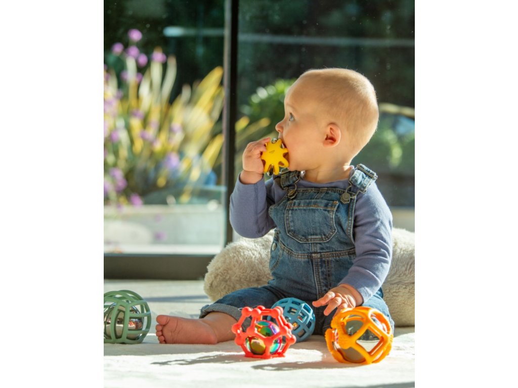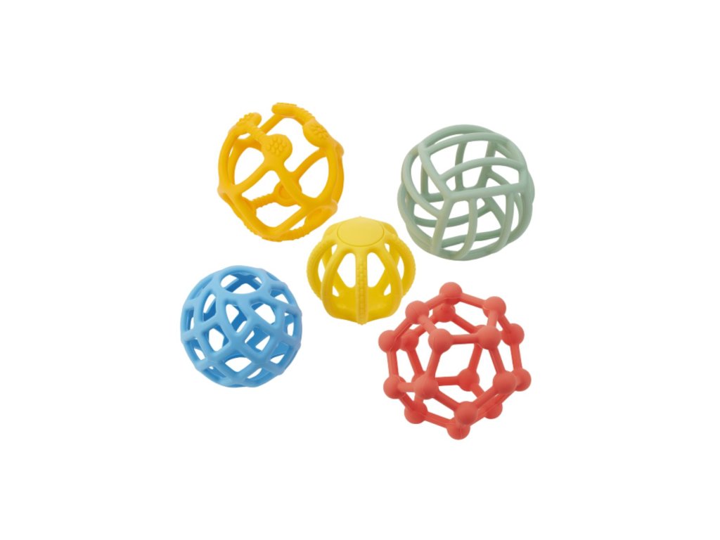 Sada obsahuje pět měkkých silikonových míčků v zářivých duhových barvách. Každá koule má jiný průměr (cca 70–100 mm) a perforovaný povrch. Jsou navrženy tak, aby stimulovaly dětský hmatový vjem a podporovaly rozvoj jemné motoriky i koordinace ruky a oka. Díky své flexibilitě a snadné uchopitelnosti jsou míčky vhodné pro dětské ruce již od raného věku.