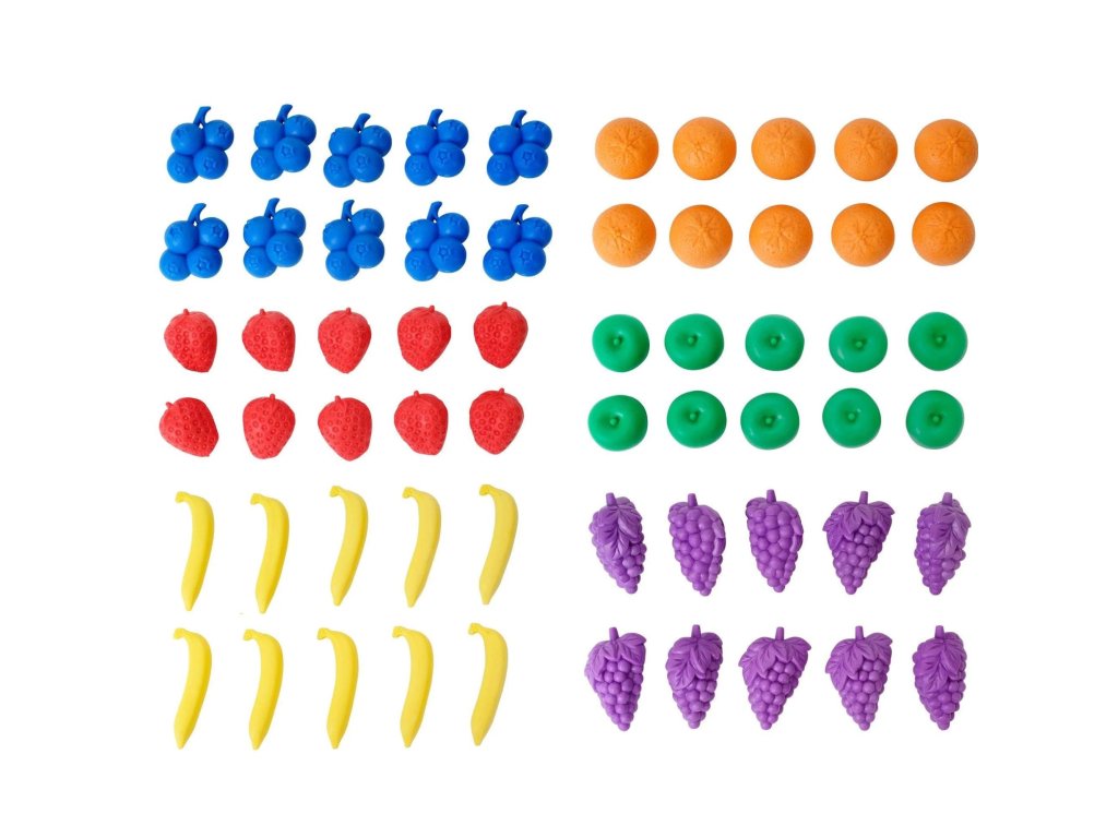 Sada obsahuje: 18x červené jahody, 18x zelená jablka, 18x fialové hrozny, 18x žluté banány, 18x modré borůvky a 18x oranžové pomeranče.