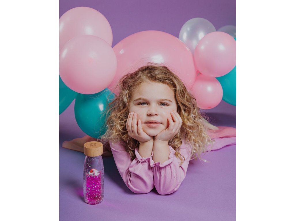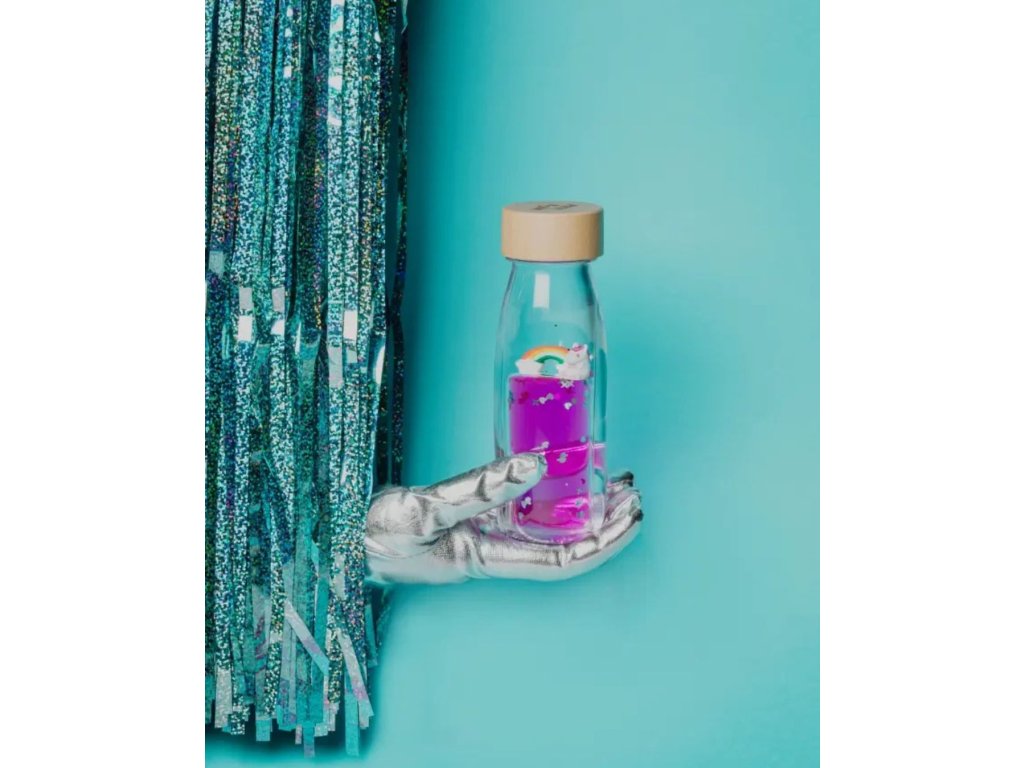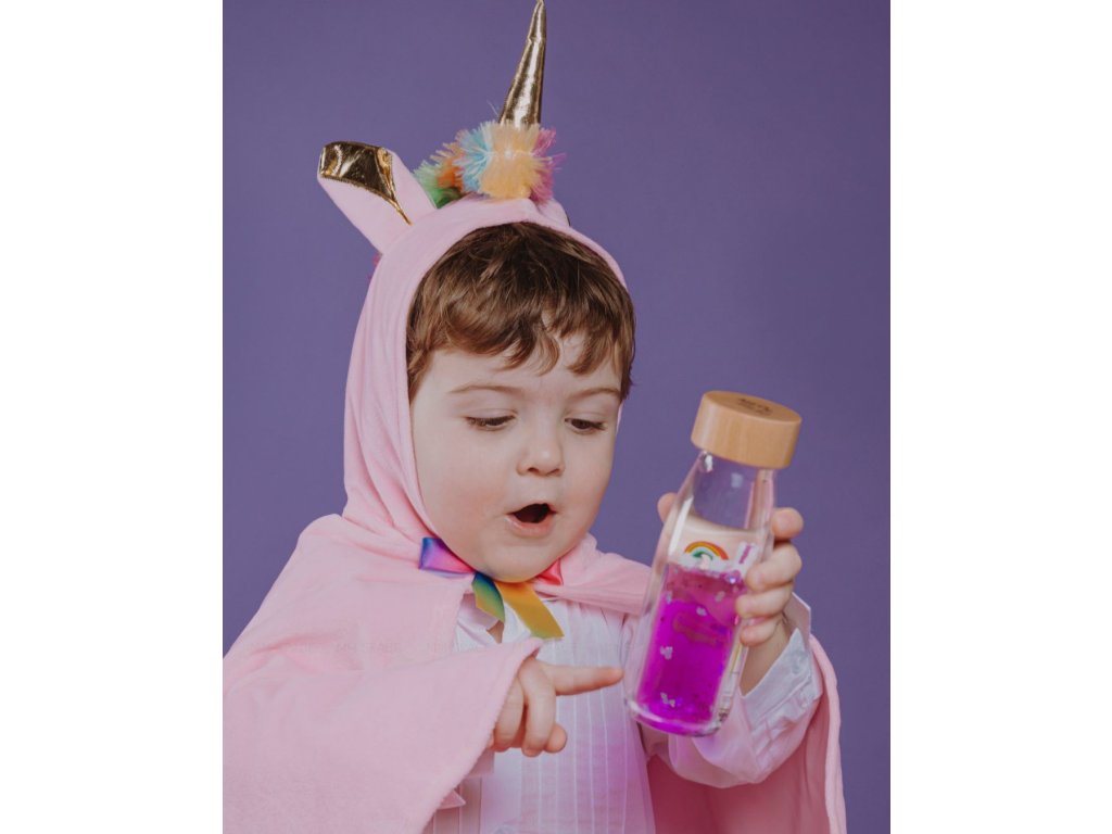 Petit Boum senzorická lahvička je navržena pro stimulaci smyslů a představivosti dětí. Tato kouzelná lahvička obsahuje dvoufázovou kapalinu, která vytváří fascinující vizuální efekty při pohybu. Děti mohou pozorovat barevné víry a třpytky, které podněcují jejich fantazii a podporují klid a soustředění. Produkt je vyroben z bezpečných materiálů, což z něj činí ideální nástroj pro smyslový rozvoj a zábavu.