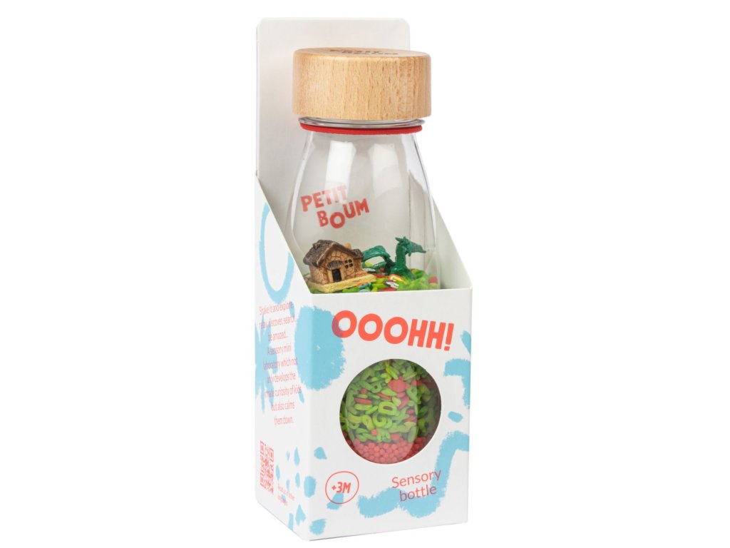 Senzorická zvuková láhev Petit Boum Drak zaujme děti od 3 měsíců hravými zvuky, barvami a figurkami uvnitř. Třesením a manipulací s lahví děti rozvíjejí sluch, zrak, hmat i jemnou motoriku. Hračka podporuje smyslovou integraci, představivost a pomáhá ke zklidnění i zvládání napětí. Barevné motivy inspirované přírodou podněcují dětskou zvědavost a kreativitu.