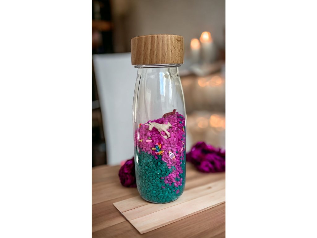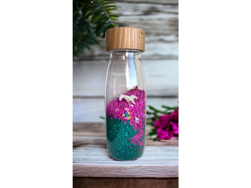 Senzorická zvuková láhev Petit Boum Jednorožec zaujme děti od 3 měsíců hravými zvuky, barvami a figurkami uvnitř. Třesením a manipulací s lahví děti rozvíjejí sluch, zrak, hmat i jemnou motoriku. Hračka podporuje smyslovou integraci, představivost a pomáhá ke zklidnění i zvládání napětí. Barevné motivy inspirované přírodou podněcují dětskou zvědavost a kreativitu.