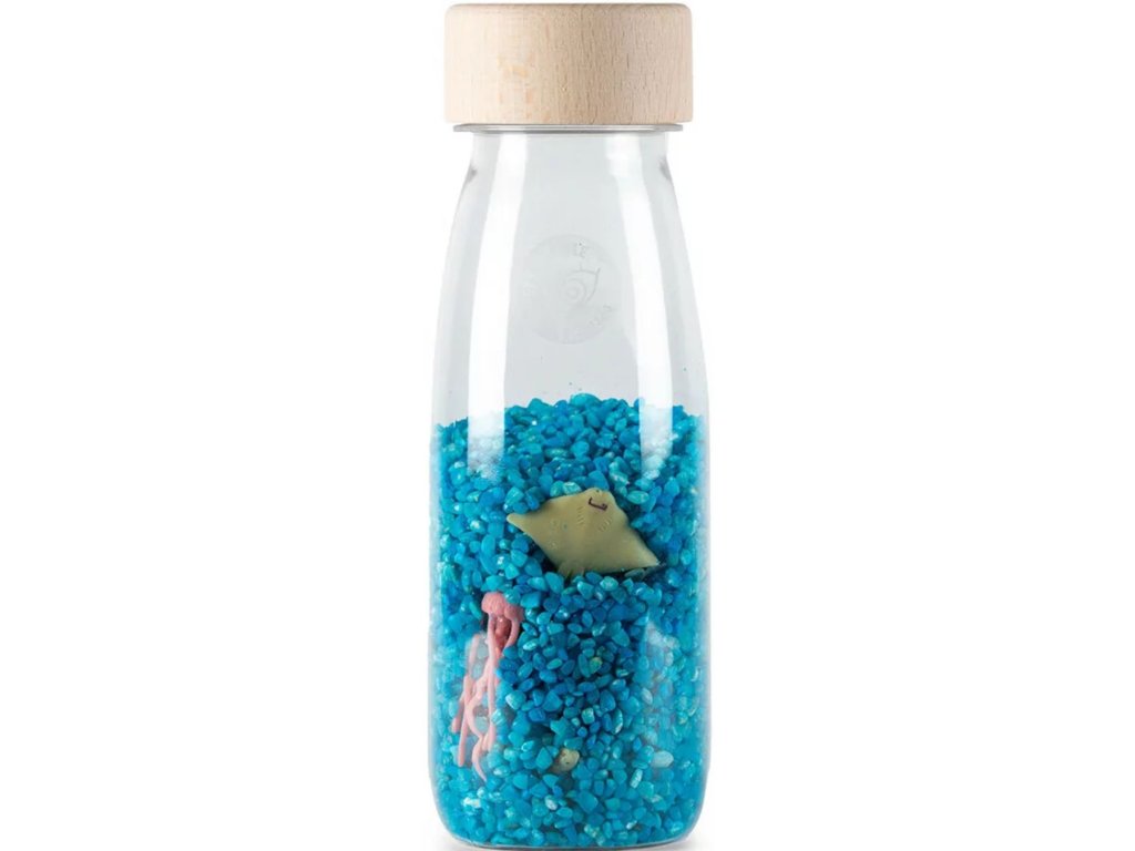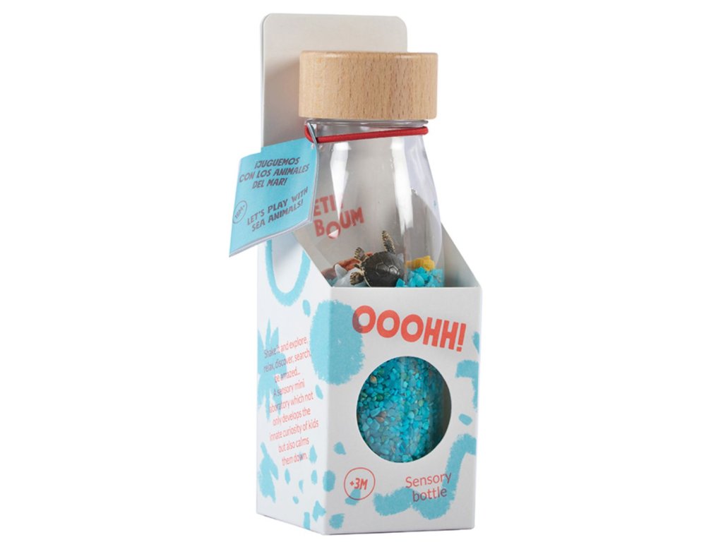 Senzorická zvuková láhev Petit Boum Oceán zaujme děti od 3 měsíců hravými zvuky, barvami a figurkami uvnitř. Třesením a manipulací s lahví děti rozvíjejí sluch, zrak, hmat i jemnou motoriku. Hračka podporuje smyslovou integraci, představivost a pomáhá ke zklidnění i zvládání napětí. Barevné motivy inspirované přírodou podněcují dětskou zvědavost a kreativitu.