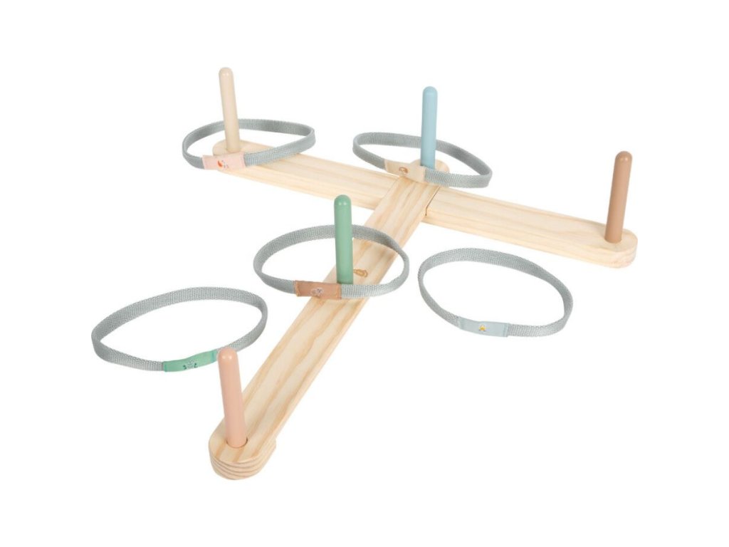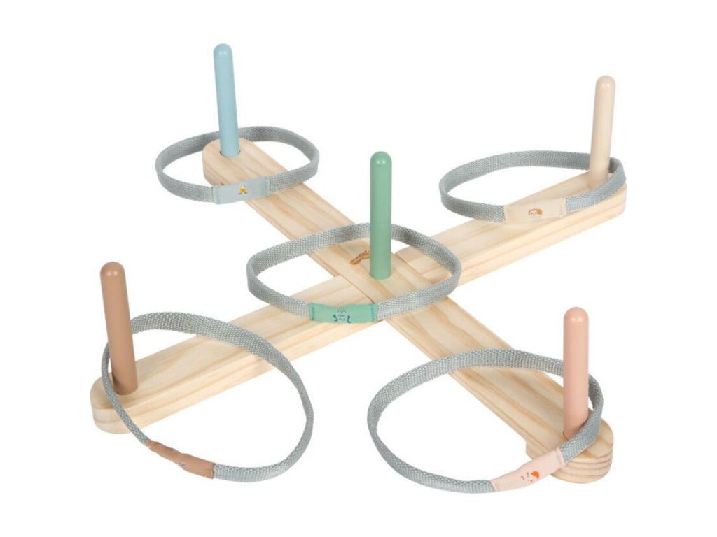 Sada se skládá z 5 tyčí a 5 házecích kroužků v odpovídajících barvách. Díky měkkému materiálu kroužků si můžete hru užít nejen venku, ale i v interiéru. Cíl s 5 tyčemi je snadno sestavitelný buď do tvaru kříže nebo písmene T. Dodává se s praktickým látkovým pytlíkem, který umožňuje snadné skladování a přepravu hry. Házení kroužků můžete zkombinovat s dalšími hrami z produktové řady Garden Buddies, které nabízejí spoustu zábavy a pohybu.