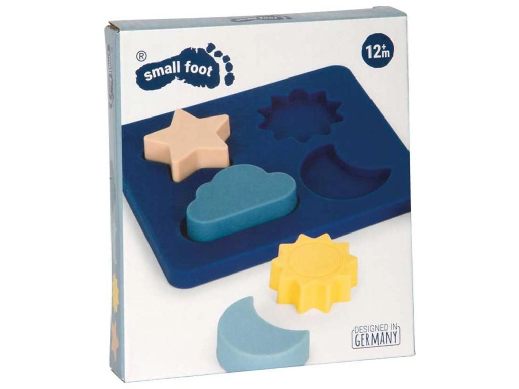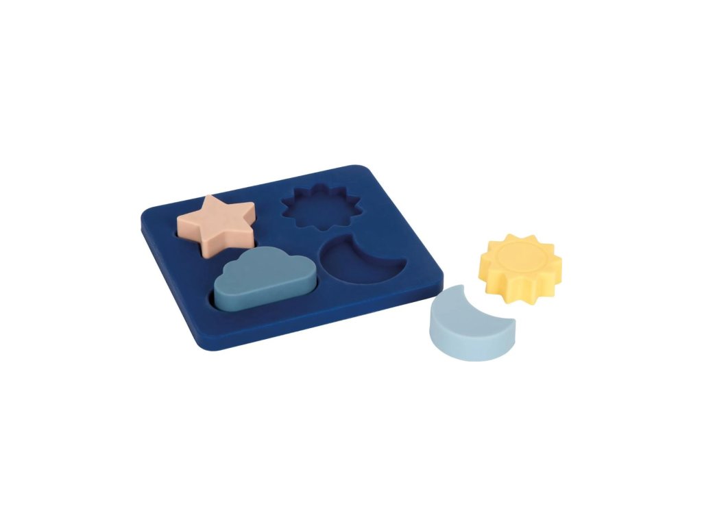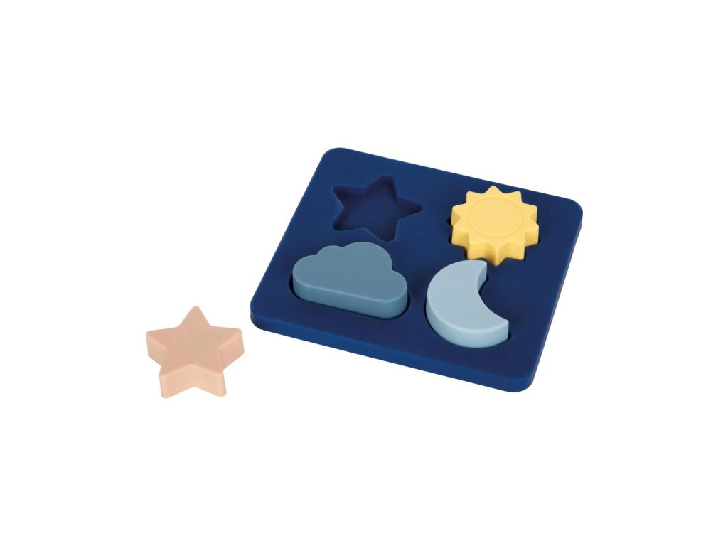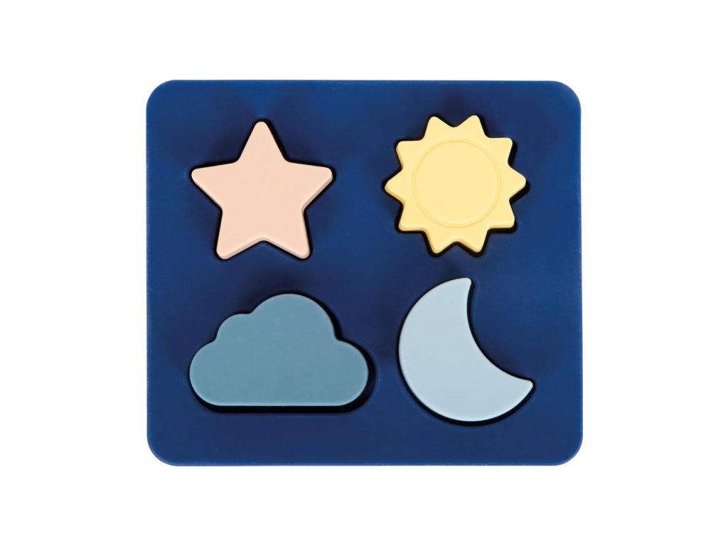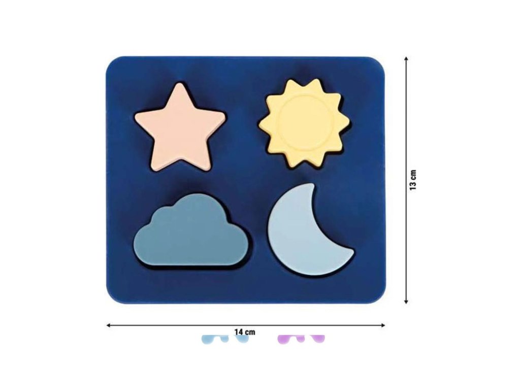 Toto roztomilé dětské puzzle ze 100% bezpečného silikonu bez BPA je ideální pro malé ručičky a zvídavé hlavičky. Skládá se ze 4 dílků ve tvaru slunce, měsíce, hvězdy a mráčku, které lze vkládat z různých stran – což nabízí mnoho hravých a vizuálně zajímavých kombinací. Puzzle je měkké, nerozbitné, bez zápachu a zcela netoxické, vyrobené z potravinářského silikonu, takže je zcela bezpečné i při kontaktu s ústy. Hodí se jak pro hraní doma, tak venku – třeba v písku, ve vodě nebo na cestách. Díky své kompaktní velikosti je skvělým společníkem do auta, na dovolenou nebo k babičce. Navíc se velmi snadno čistí.