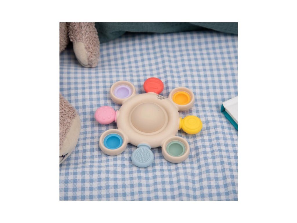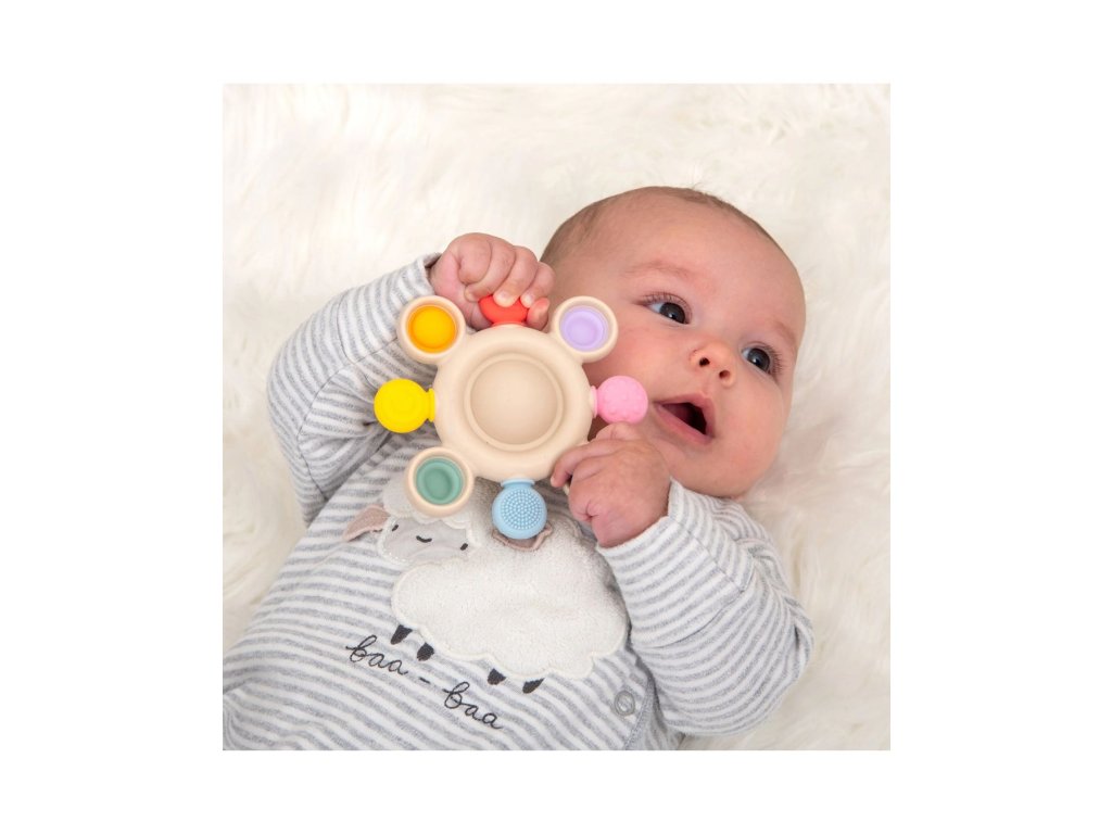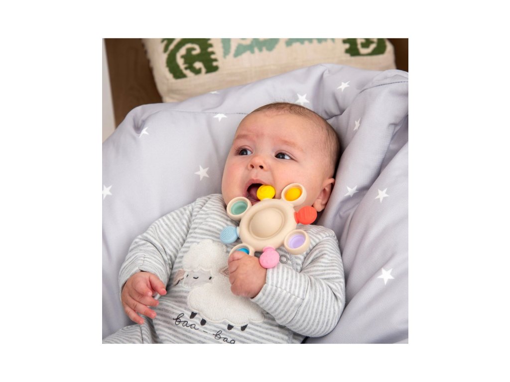 Toto multi-smyslové kousátko a chrastítko je navrženo tak, aby zvládalo několik funkcí najednou: barevná tlačítka „pop“ poskytují uspokojivý klik při mačkání a podporují objevování příčiny a následku, zatímco texturované silikonové výstupky jemně masírují dásně při prořezávání prvních zoubků, čímž dítěti přinášejí úlevu a pocit komfortu.
