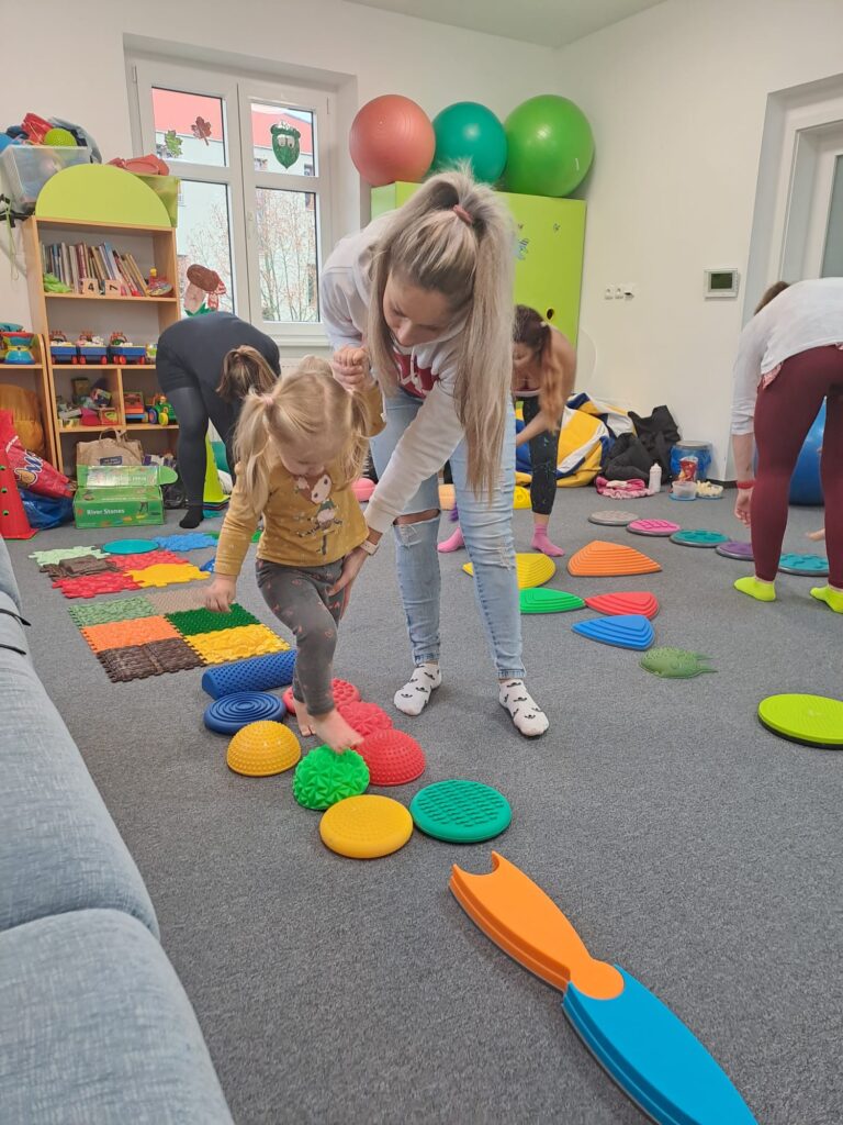 Po přednášce v Mateřském centru Koblížek následovalo cvičení a praktické ukázky, jaké pomůcky pro cvičení s dětmi používat a jak s nimi správně pracovat.