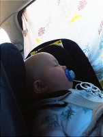 Děti často v autě usnou. Nepříjemnou situací je, že někdy dětem spadne hlava a je přetěžována krční páteř. Na internetu se objevují i tzv. fixační pásky, které se připevňují přes čelo. TY ALE NIKDY NEPOŘIZUJEME. Při nehodě a nárazu by to mělo fatální následky.