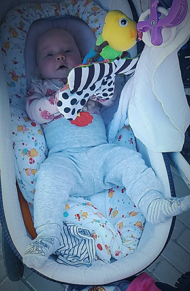 obr. 3 zvídavé nesedící dítě jezdí v hlubokém kočárku na bříšku