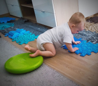 S dítětem kromě lezení a přelézání překážek můžeme trénovat dosedání na paty, pokládání zadečku ke straně z pozice v kleku a trénovat tzv. šikmý sed (dítě si pomáhá opřením o horní končetinu), dítě by mělo mít zvládnuty otočky na obě strany, můžete válet sudy.