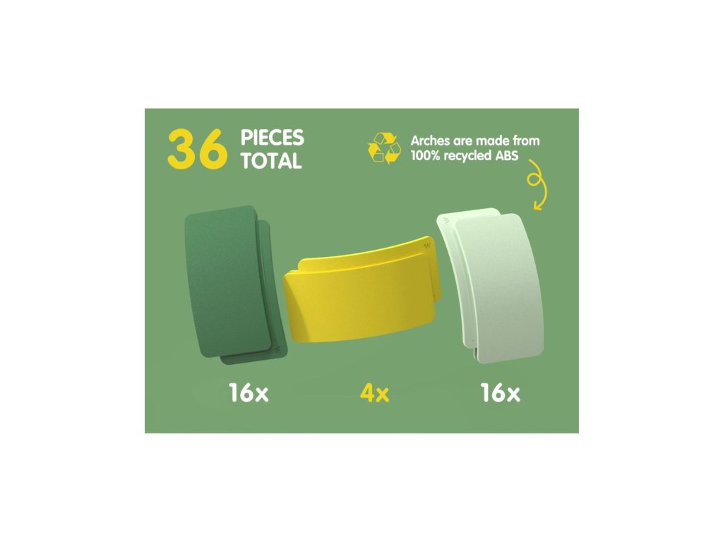 Arches jsou vyráběny v Evropě ze 100% recyklovaného plastu! Jsou to bezpečné, udržitelné a odolné hračky, které rostou s vaším dítětem. Jsou plně kompatibilní s ostatními produkty systému Waytoplay, takže vaše silnice se promění v rampy, tunely nebo mistrovská architektonická díla!