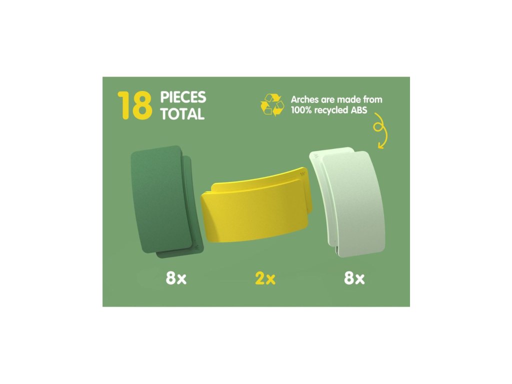 Arches jsou vyráběny v Evropě ze 100% recyklovaného plastu! Jsou to bezpečné, udržitelné a odolné hračky, které rostou s vaším dítětem. Jsou plně kompatibilní s ostatními produkty systému Waytoplay, takže vaše silnice se promění v rampy, tunely nebo mistrovská architektonická díla!