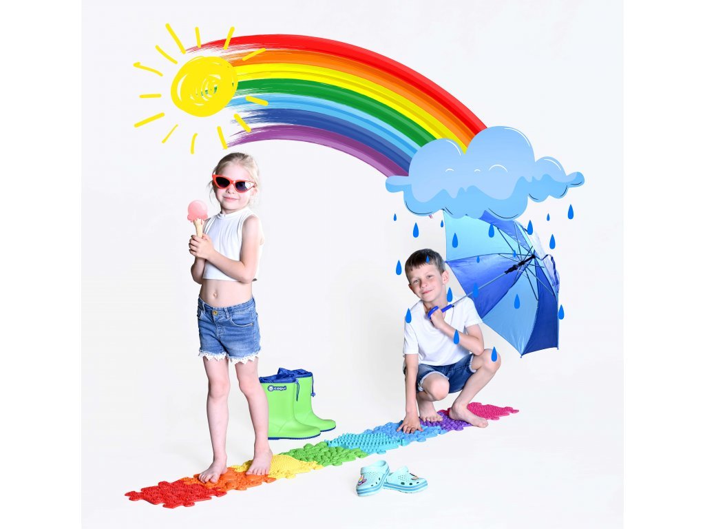 Také milujete, když déšť společně se slunečními paprsky namalují duhu? Pojďte si ji vytvořit přímo u Vás doma! MUFFIK masážní koberečky jsou určeny pro rozvoj správné chůze, držení těla a jeho celkovou posturu, zvláště pak pro posílení středu těla a hlubokého stabilizačního systému. Set doporučujeme jako jeden ze základních, který pak můžete dále doplňovat o podlahy, které Vám budou sedět pocitově nejlépe.