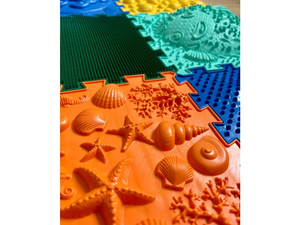 Sada Ortho Puzzle Mořský svět obsahuje 6 ortopedických podlah a je vhodná pro děti (zdatnější chodce) i dospělé. Obsahuje také 3D díly.