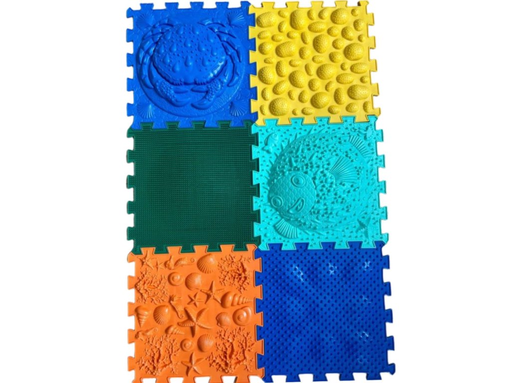 Set ortopedických podložek Ortho Puzzle Mořský svět je vhodný ke stimulaci chodidel, trénování rovnováhy i koordinace, aktivace středu těla, aktivace klenby, valgozitu.