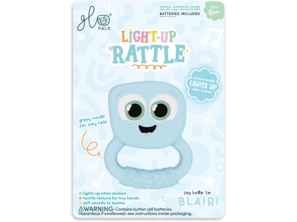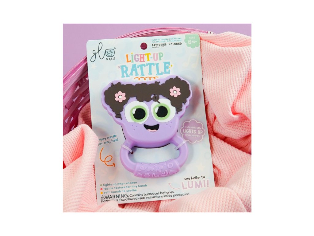 Svítící chrastítko Glo Pals Light-Up Rattle Lumi rozzáří každý dětský den a promění první objevování světa v kouzelné smyslové dobrodružství. Chrastítko reaguje na každý pohyb světelným efektem, který okamžitě přitáhne pozornost miminka a podpoří jeho přirozenou zvídavost. Díky lehkému, snadno uchopitelnému tvaru pomáhá rozvíjet úchop, koordinaci a jemnou motoriku.